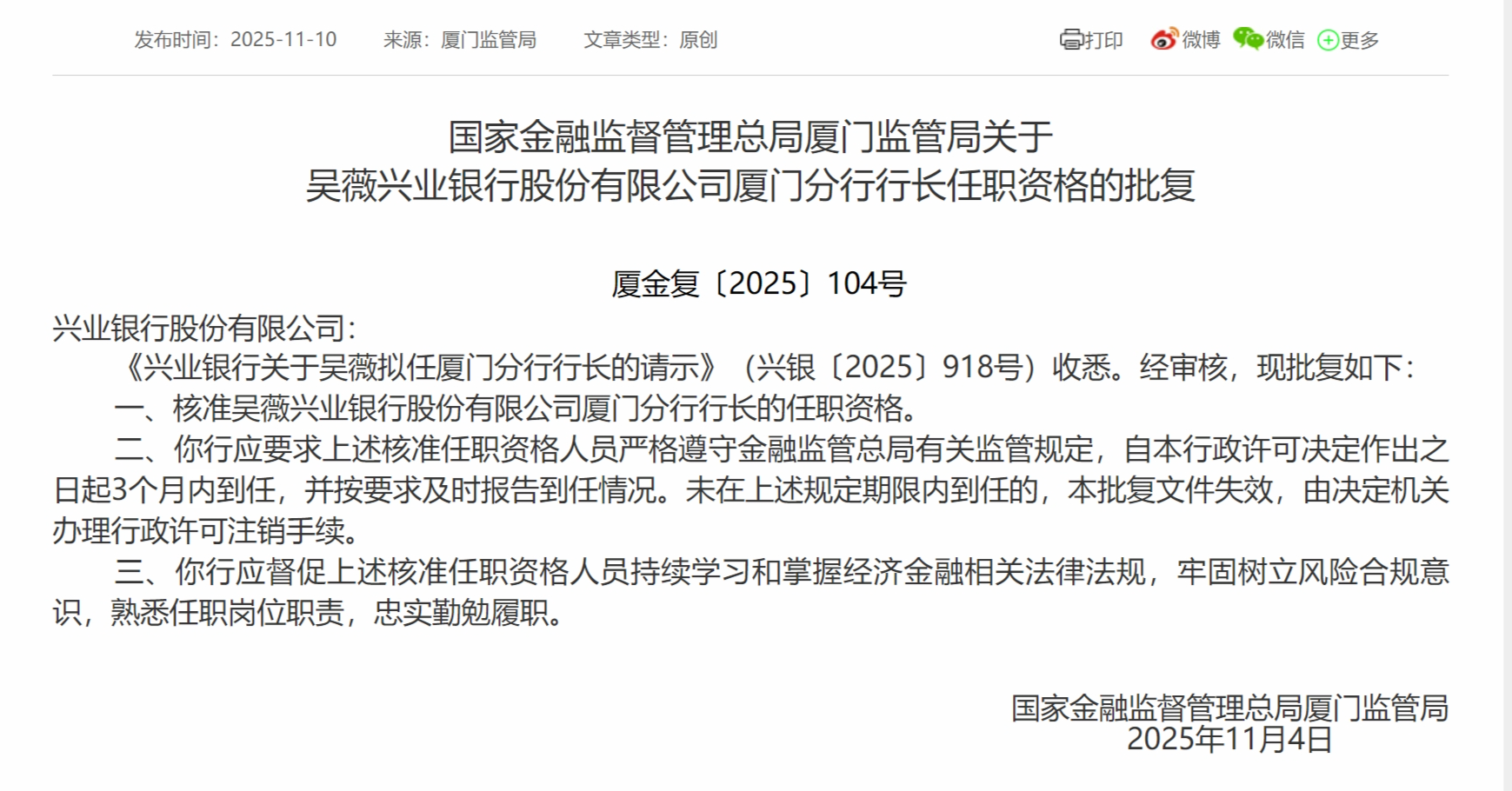 11月10日股票配资什么平台好,国家金融监督管理总局厦门监管局发布关于吴薇兴业银行股份有限公司厦门分行行长任职资格的批复,核准吴薇兴业银行股份有限公司厦门分行行长的任职资格。